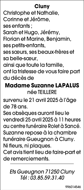 Décédée à Cluny (71250, France) le lundi 21 avril 2025 à l'âge de 78 ans
