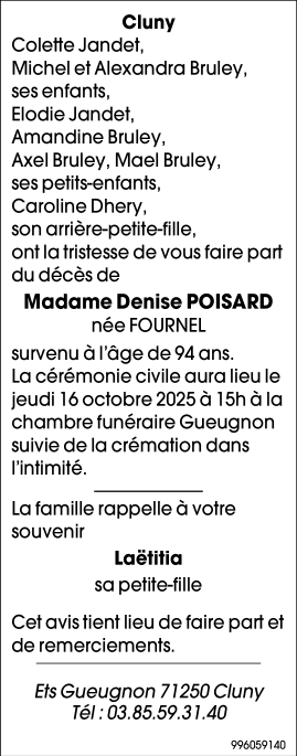 Décédée à Cluny (71250, France) le jeudi 9 octobre 2025 à l'âge de 94 ans